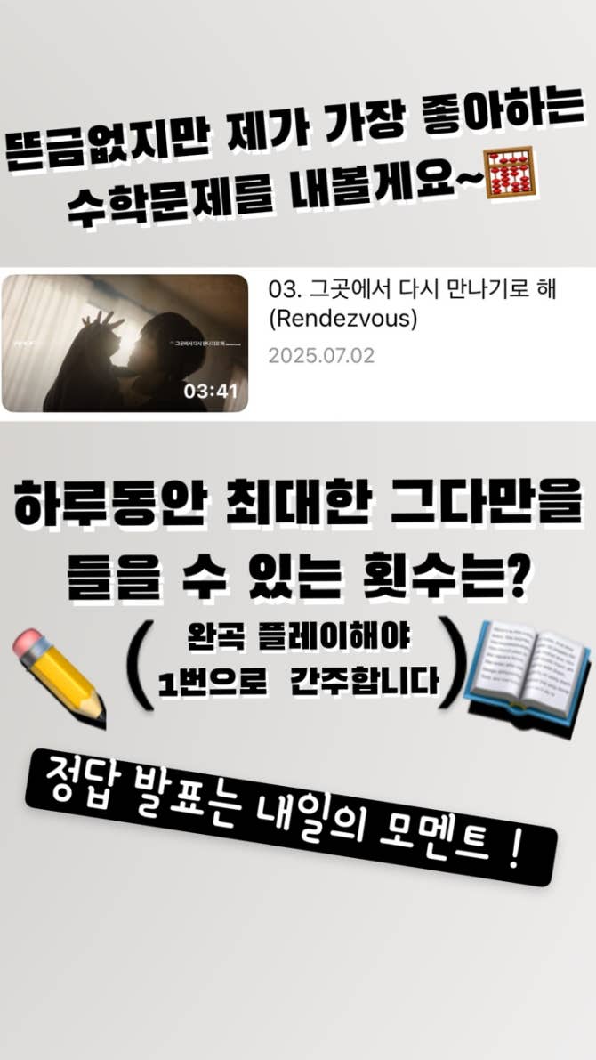 뜬금없지만 제가 가장 좋아하는 수학문제를 내볼게요~🧮하루동안 최대한 그다만을 들을 수 있는 횟수는?완곡 플레이해야 1번으로 간주합니다)(📖✏️정답 발표는 내일의 모멘트!