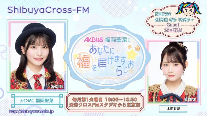 AKB48 Community Post - / 本日3/3(火)18:00〜 #渋谷クロスFM🎎 「AKB48 #福岡聖菜 のあなたに福を届けますらじお⭐」に #太田有紀 が出演します🎈✨ \ どうぞお楽しみに🎀 #AKB48 - AKB48_Official