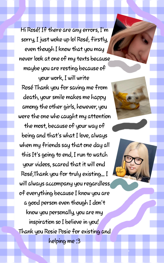 Hi Rosé! If there are any errors, I'm sorry, I just woke up lol Rosé, firstly, even though I know that you may never look at one of my texts because maybe you are resting because of your work, I will