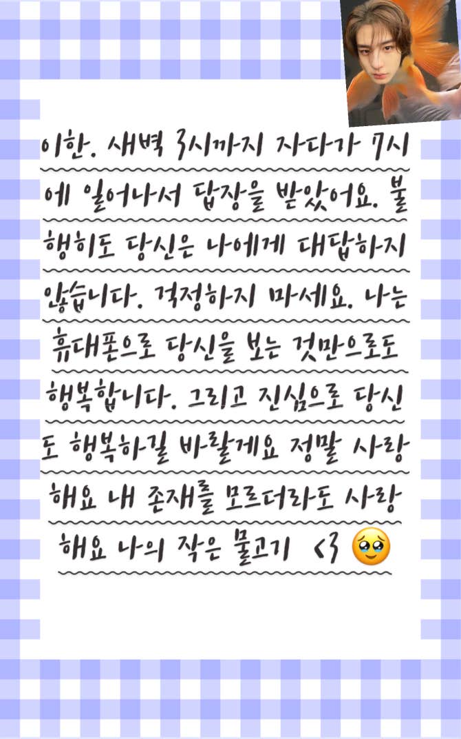 이한. 새벽 3시까지 자다가 7시에 일어나서 답장을 받았어요. 불행히도 당신은 나에게 대답하지 않습니다. 걱정하지 마세요. 나는 휴대폰으로 당신을 보는 것만으로도 행복합니다. 그리고 진심으로 당신도 행복하길 바랄게요 정말 사랑해요 내 존재를 모르더라도 사랑해요 나의 작은 물고기 <3 🥹