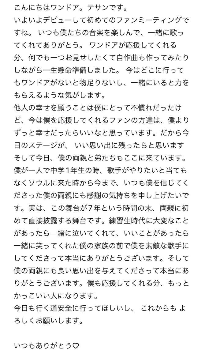 BOYNEXTDOOR Community Post - デビューしてから一度も泣いたことなかったテサンが、初めて両親に見せるステージで初めて涙した。 諦めないで7年も練習生を続けて、デビューしてくれて、素敵な歌手になってくれてありがとう。