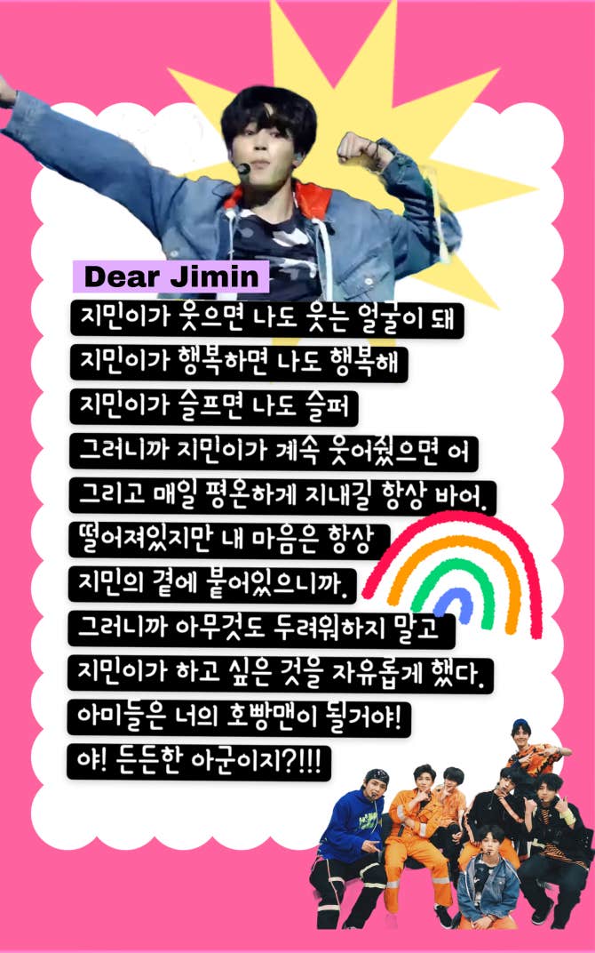 지민이가 웃으면 나도 웃는 얼굴이 돼 지민이가 행복하면 나도 행복해 지민이가 슬프면 나도 슬퍼 그러니까 지민이가 계속 웃어줬으면 어 그리고 매일 평온하게 지내길 항상 바어. 떨어져있지만 내 마음은 항상 지민의 곁에 붙어있으니까. 그러니까 아무것도 두려워하지 말고 지민이가 하고 싶은 것을 자유롭게 했다. 아미들은 너의 호빵맨이 될거야! 야! 든든한 아군이