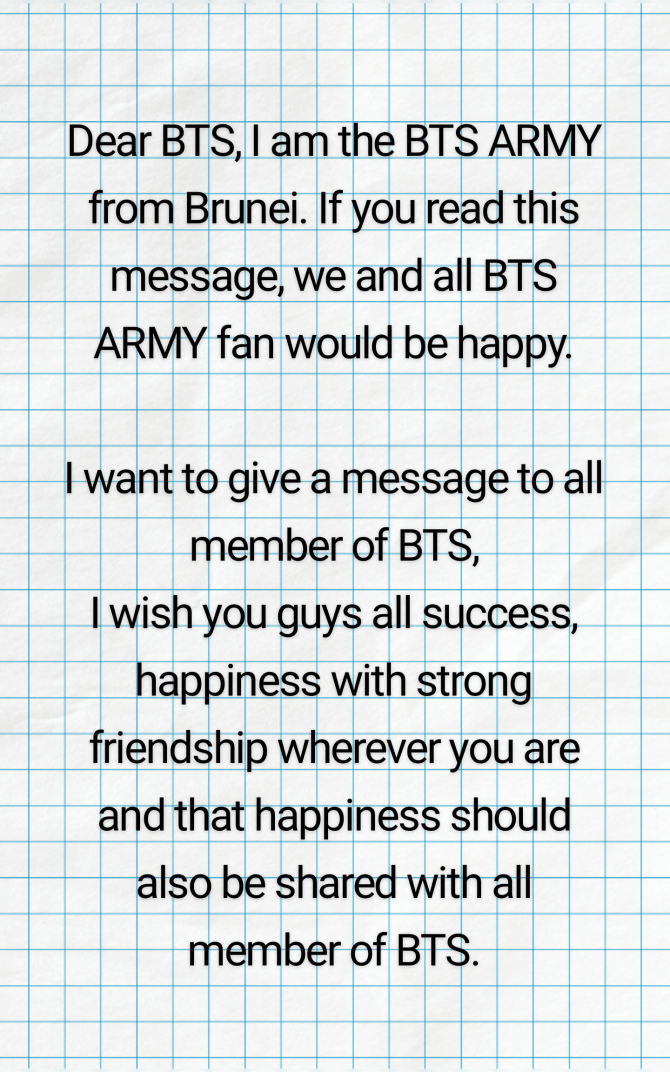 Dear BTS, I am the BTS ARMY from Brunei. If you read this message, we and all BTS ARMY fan would be happy. I want to give a message to all member of BTS, I wish you guys all success, happiness with st