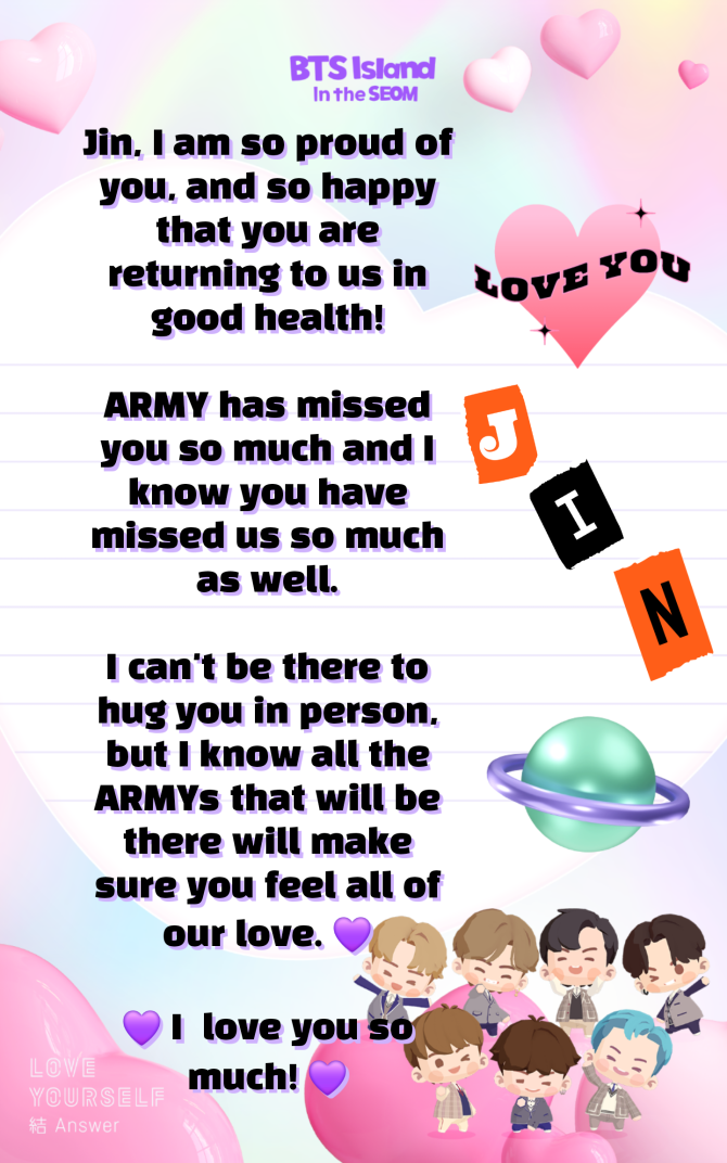 Jin, I am so proud of you, and so happy that you are returning to us in good health! ARMY has missed you so much and I know you have missed us so much as well. I can't be there to hug you in person, b