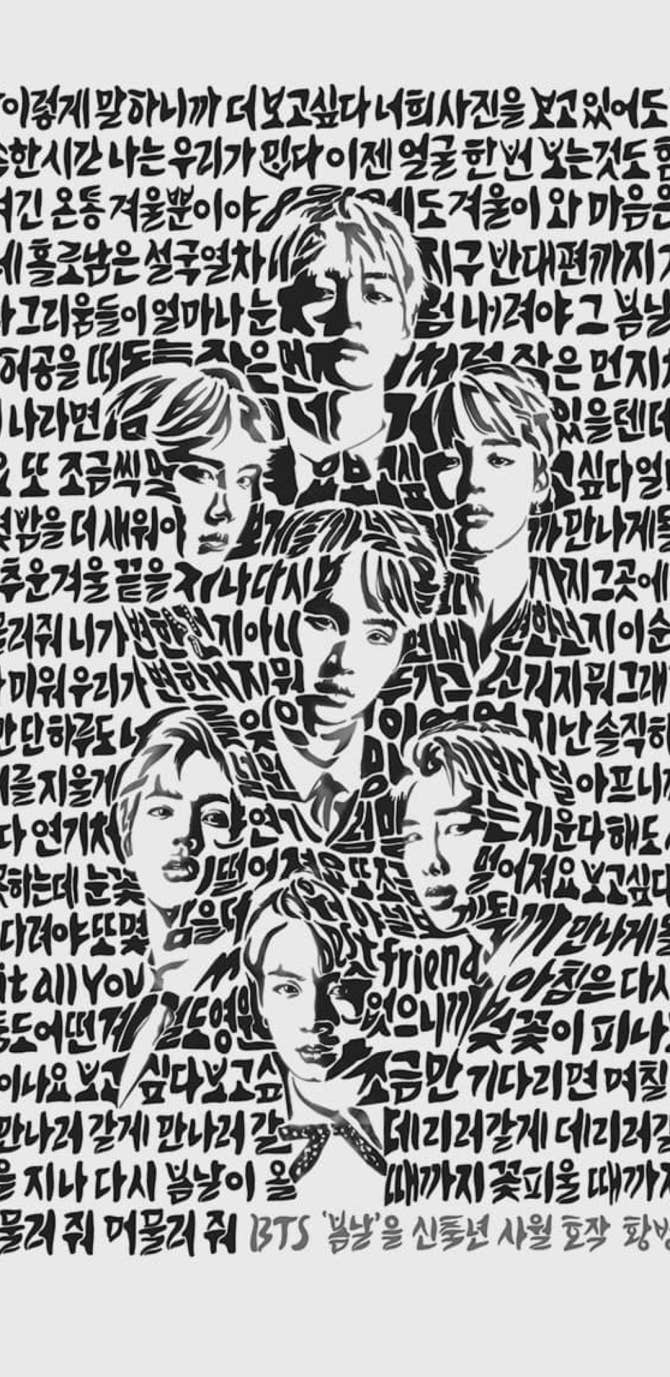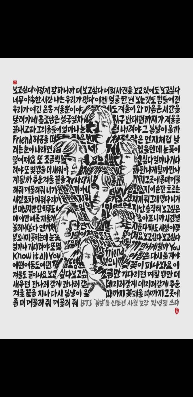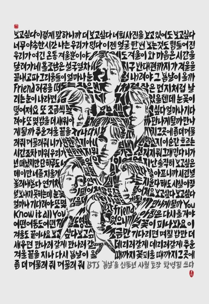 BTS Community Post - A fellow member at a news/politics website is a painter/calligrapher, and he has created a typographic portrait of BTS with the lyrics from “Spring Day” in Hangul calligraphic form(75 x 115); it’s cur
