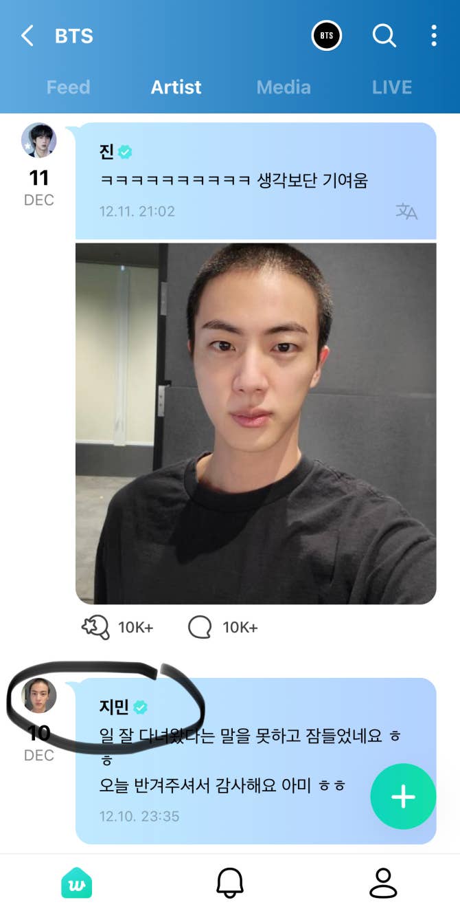 BTS Community Post - The fact that jimin changed his display picture to bald jin 😭😂🤍