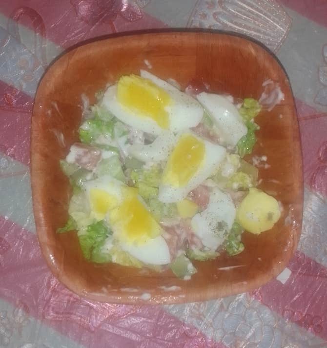 Today lunch was a healthy salad made of cucumber slices, tomatoes, lettuce, a little salt, black pepper, olive oil, and a b