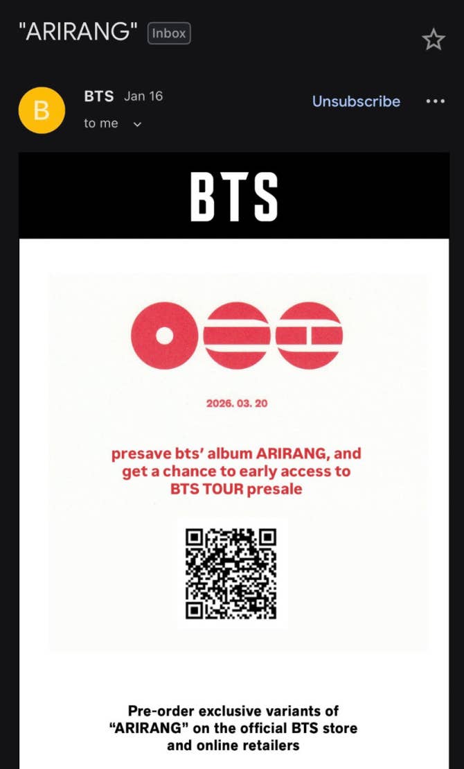 ARMY!!!! If you pre save BTS’ new album on spotify, you will get a chance to get early access to bts tour presale!!!! You can scan the qr code or here’s the link