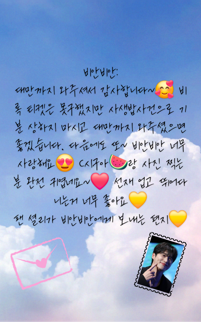 비안비안: 대만까지 와주셔서 감사합니다~🥰 비록 티켓은 못구했지만 사생밥사건으로 기분 상하지 마시고 대만까지 와주셨으면 좋겠습니다. 다음에도 또~ 비안비안 너무 사랑해요😍 (시구아🍉랑 사진 찍는 분 완전 귀엽네요~❤️ 선재 업고 뛰어다니는거 너무 좋아요💛 팬 셜리가 비안비안에게 보내는 편지💛