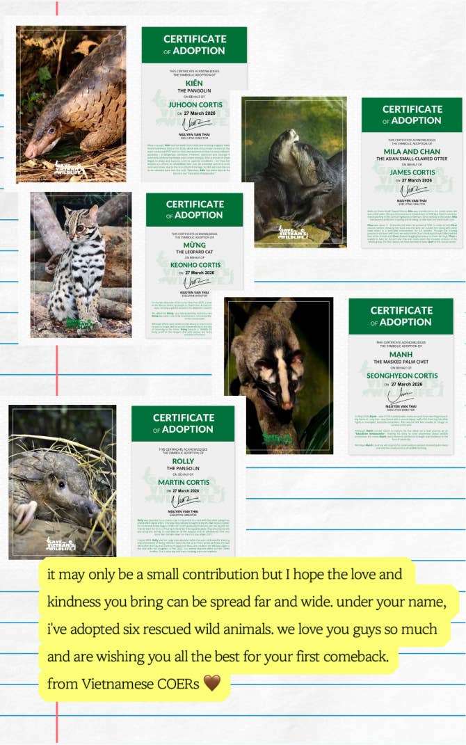 it may only be a small contribution but I hope the love and kindness you bring can be spread far and wide. under your name, i've adopted six rescued wild animals. we love you guys so much and are wish