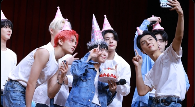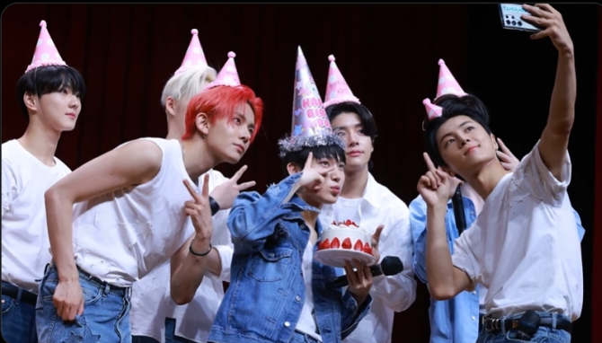 enha selca with our birthday boy sunoo at today's fansign😭🩷they're looking so cute wearing party hats😭🤏