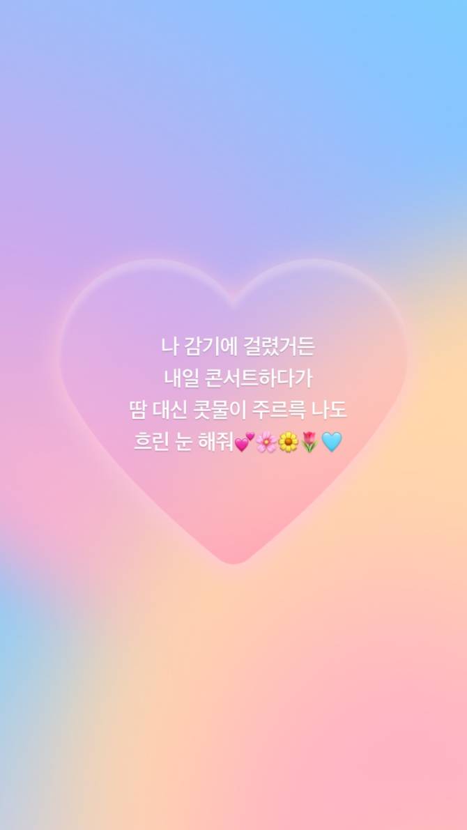 나 감기에 걸렸거든 내일 콘서트하다가 땀 대신 콧물이 주르륵 나도 흐린 눈 해줘💕🌸🌼🌷🩵