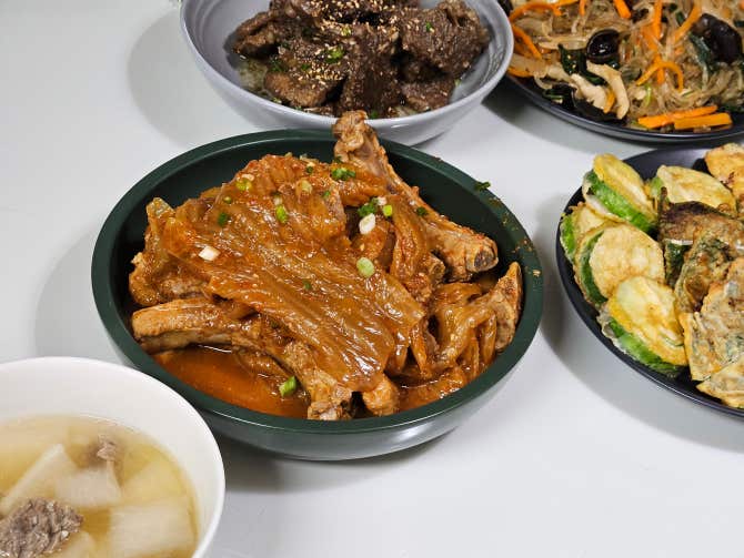 김치등갈비찜이랑 la갈비랑 잡채랑 모듬전이랑 소고기무국입니다
